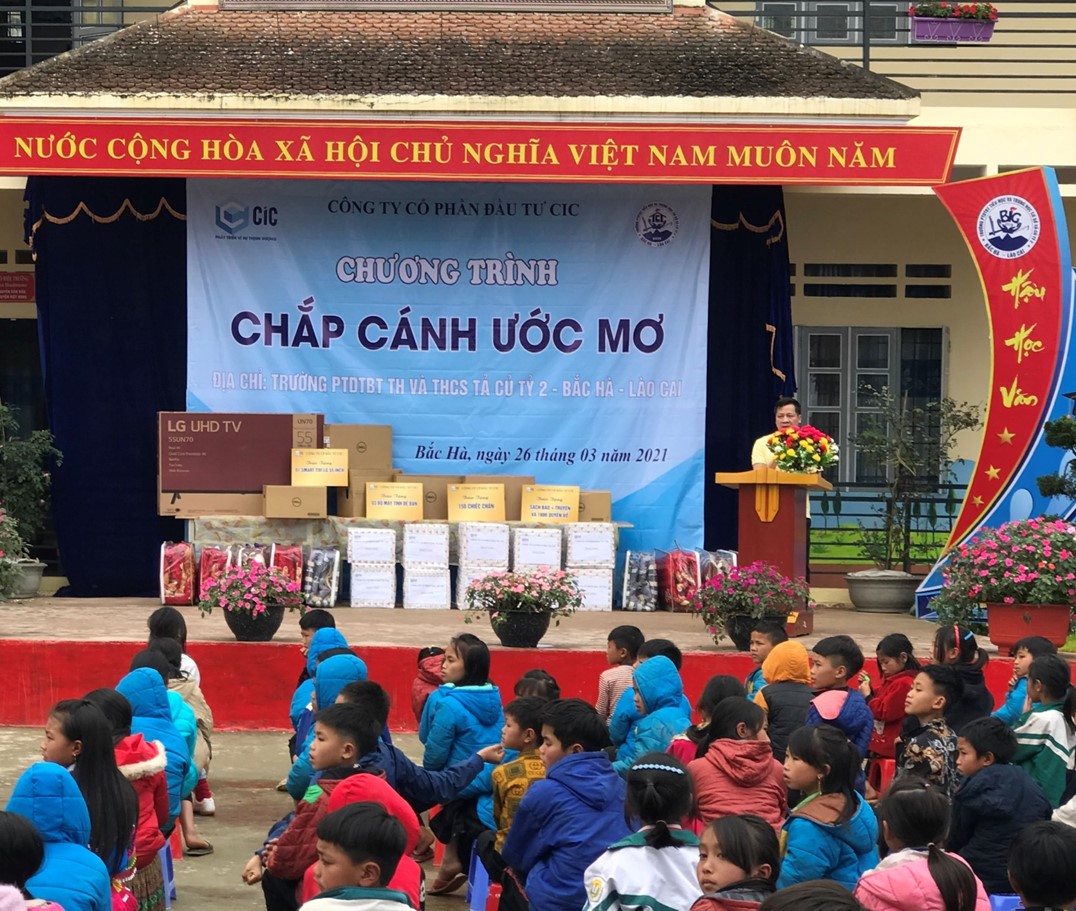 Sau khi đi khảo sát thực tế và phối hợp với Lãnh đạo địa phương trường Tiểu học và Trung học cơ sở Tả Củ Tỷ 2, huyện Bắc Hà, tỉnh Lào Cai. Ban lãnh đạo Công ty cùng Đoàn thanh niên đã tổ chức buổi từ thiện trao tận tay các phần quà cho các em nhỏ: Chăn ấm, sách, vở, truyện và một số thiết bị hỗ trợ cơ sở vật chất cho công tác dạy học tại trường gồm có: Ti vi, máy tính cho các cháu vào đúng dịp kỷ niệm 90 năm ngày thành lập đoàn 26/3/2021. Những phần quà trao đi là tình yêu thương, mong muốn cuộc sống các em bớt đi một phần khó khăn, thiệt thòi, là niềm tin “ chắp cánh ước mơ ’’ của các em!