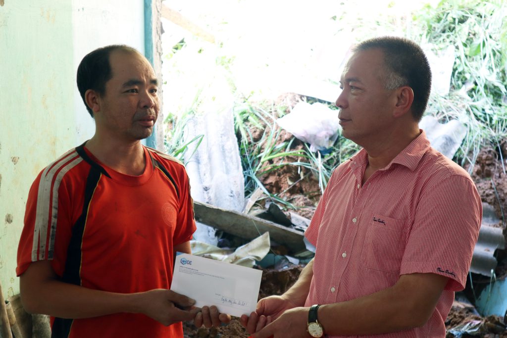 Ông Thái Quang Thọ – đại diện Công ty CIC, thăm hỏi, động viên các hộ dân bị thiệt hại do mưa bão.