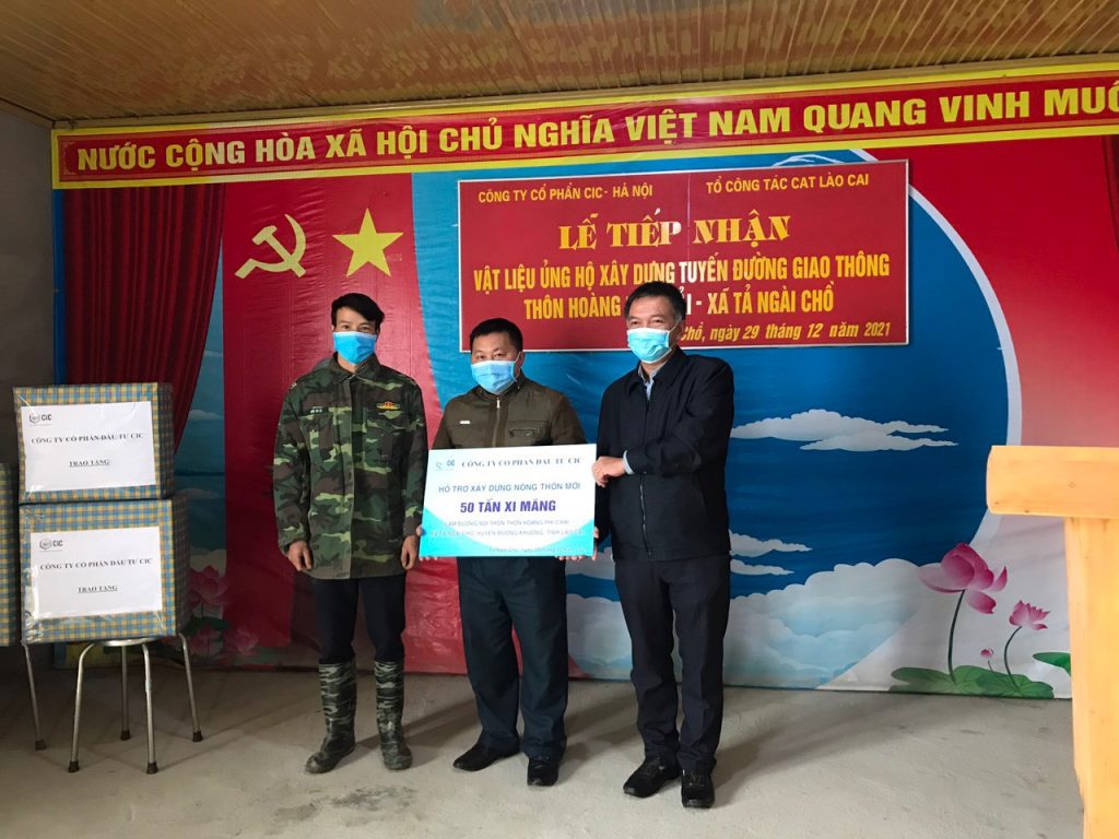 Hưởng ứng lễ phát động Phong trào thi đua chung sức xây dựng nông thôn mới và giảm nghèo bền vững, qua khảo sát thực tế, Công ty Cổ phần đầu tư CIC đã ủng hộ 50 tấn xi măng cùng các phần quà, góp phần xây dựng đường nội thôn thôn Hoàng Phì Chải, xã Tả Ngài Chồ, huyện Mường Khương, Tỉnh Lào Cai.